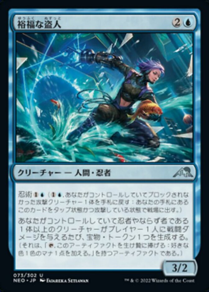 | Rules | Ninjutsu (, Return an unblocked attacker you control to hand: Put this card onto the battlefield from your hand tapped and attacking.) Whenever one or more Ninja or Rogue creatures you control deal combat damage to a player, create a Treasure token. (It's an artifact with ", Sacrifice this artifact: Add one mana of any color.") |