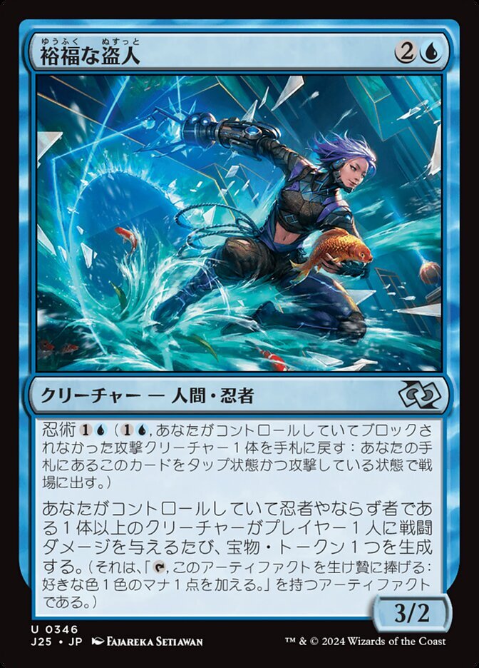 | Rules | Ninjutsu (, Return an unblocked attacker you control to hand: Put this card onto the battlefield from your hand tapped and attacking.) Whenever one or more Ninja or Rogue creatures you control deal combat damage to a player, create a Treasure token. (It's an artifact with ", Sacrifice this artifact: Add one mana of any color.") |