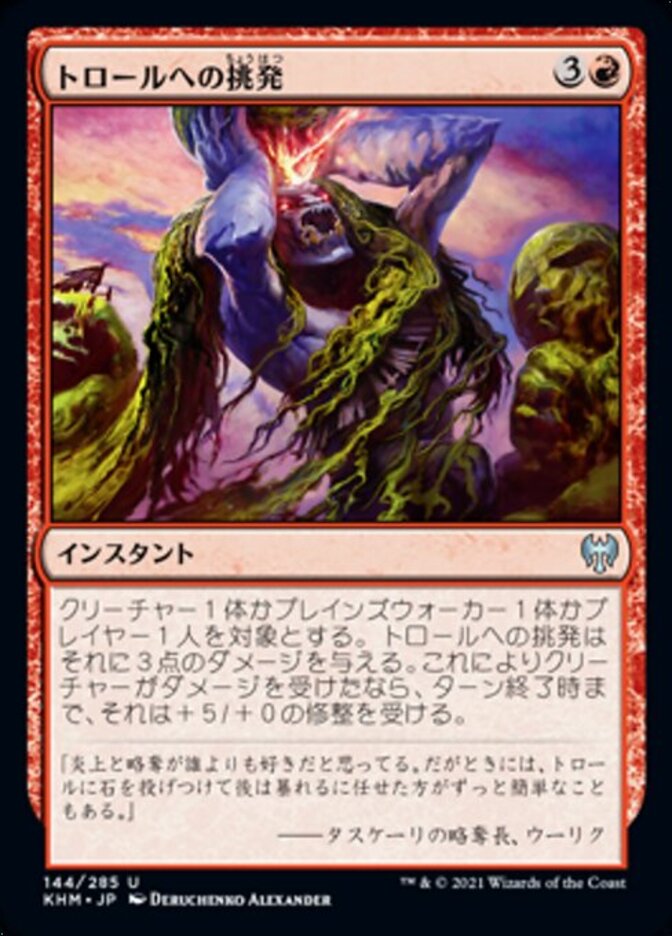 | Rules | Provoke the Trolls deals 3 damage to any target. If a creature is dealt damage this way, it gets +5/+0 until end of turn. |