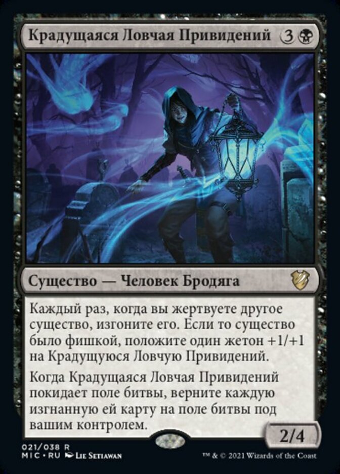| Rules | Whenever you sacrifice another creature, exile it. If that creature was a token, put a +1/+1 counter on Prowling Geistcatcher. When Prowling Geistcatcher leaves the battlefield, return each card exiled with it to the battlefield under your control. |