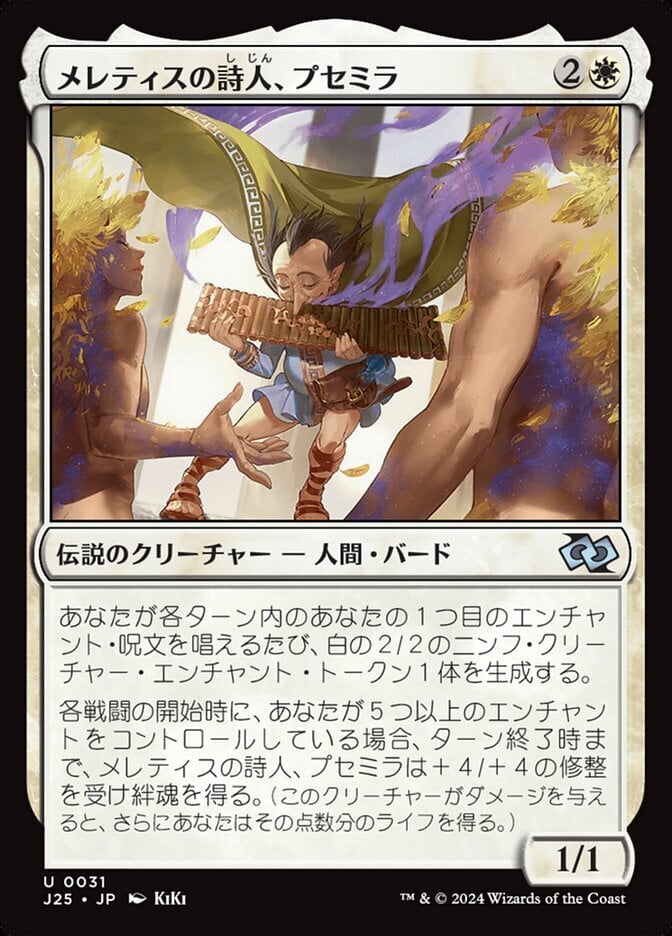 | Rules | Whenever you cast your first enchantment spell each turn, create a 2/2 white Nymph enchantment creature token. At the beginning of each combat, if you control five or more enchantments, Psemilla, Meletian Poet gets +4/+4 and gains lifelink until end of turn. (Damage dealt by this creature also causes you to gain that much life.) |