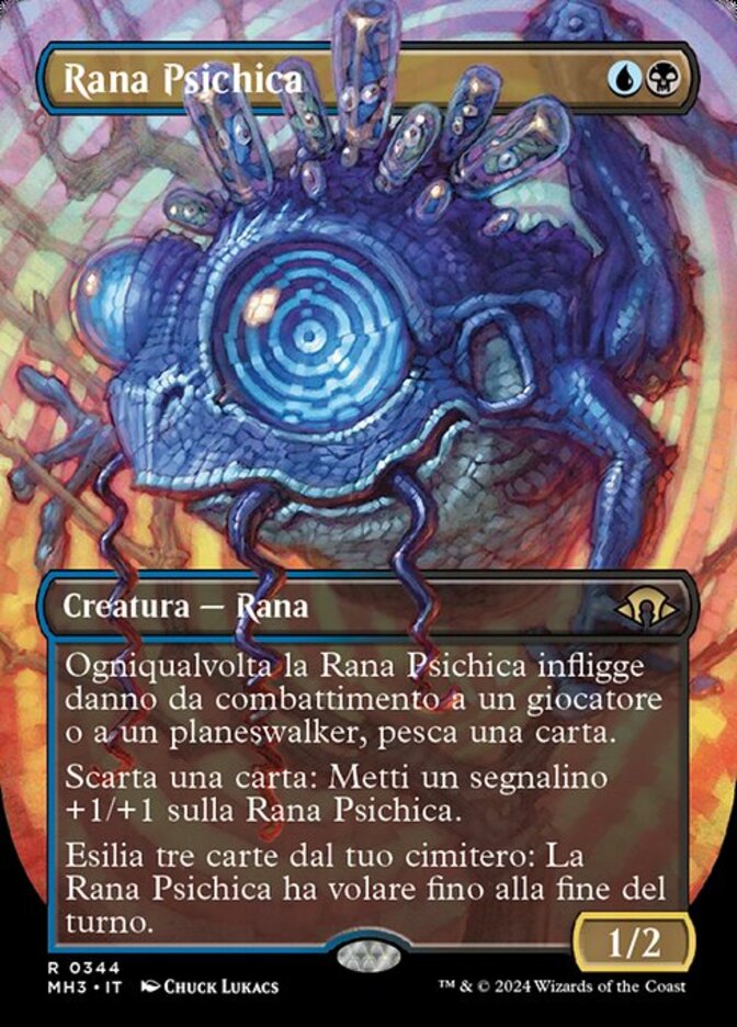 | Rules | Whenever Psychic Frog deals combat damage to a player or planeswalker, draw a card. Discard a card: Put a +1/+1 counter on Psychic Frog. Exile three cards from your graveyard: Psychic Frog gains flying until end of turn. |