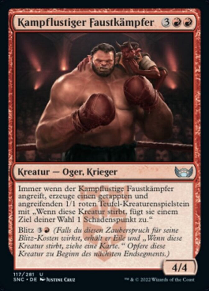 | Rules | Whenever Pugnacious Pugilist attacks, create a tapped and attacking 1/1 red Devil creature token with "When this creature dies, it deals 1 damage to any target." Blitz (If you cast this spell for its blitz cost, it gains haste and "When this creature dies, draw a card." Sacrifice it at the beginning of the next end step.) |