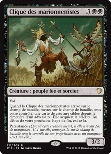 | Rules | Flying When Puppeteer Clique enters the battlefield, put target creature card from an opponent's graveyard onto the battlefield under your control. It gains haste. At the beginning of your next end step, exile it. Persist (When this creature dies, if it had no -1/-1 counters on it, return it to the battlefield under its owner's control with a -1/-1 counter on it.) |