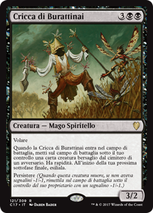 | Rules | Flying When Puppeteer Clique enters the battlefield, put target creature card from an opponent's graveyard onto the battlefield under your control. It gains haste. At the beginning of your next end step, exile it. Persist (When this creature dies, if it had no -1/-1 counters on it, return it to the battlefield under its owner's control with a -1/-1 counter on it.) |