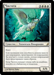 | Rules | Flying If noncombat damage would be dealt to you, prevent that damage. You gain life equal to the damage prevented this way. When Purity is put into a graveyard from anywhere, shuffle it into its owner's library. |
