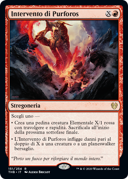 | Rules | Choose one — • Create an X/1 red Elemental creature token with trample and haste. Sacrifice it at the beginning of the next end step. • Purphoros's Intervention deals twice X damage to target creature or planeswalker. |