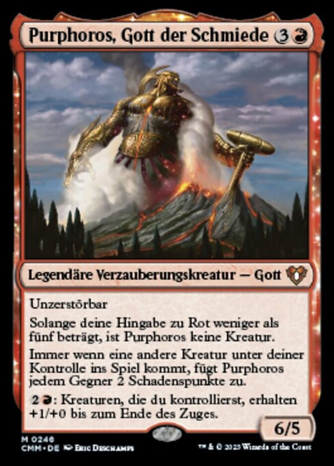 | Rules | Indestructible As long as your devotion to red is less than five, Purphoros isn't a creature. Whenever another creature enters the battlefield under your control, Purphoros deals 2 damage to each opponent. : Creatures you control get +1/+0 until end of turn. |