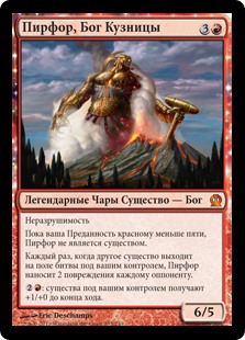 | Rules | Indestructible As long as your devotion to red is less than five, Purphoros isn't a creature. Whenever another creature enters the battlefield under your control, Purphoros deals 2 damage to each opponent. : Creatures you control get +1/+0 until end of turn. |