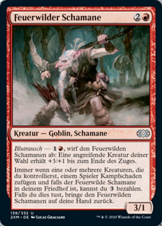 | Rules | Bloodrush — , Discard Pyrewild Shaman: Target attacking creature gets +3/+1 until end of turn. Whenever one or more creatures you control deal combat damage to a player, if Pyrewild Shaman is in your graveyard, you may pay . If you do, return Pyrewild Shaman to your hand. |