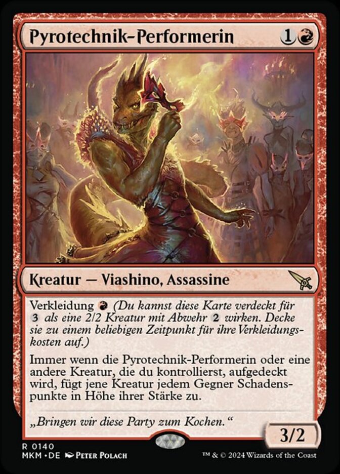 | Rules | Disguise (You may cast this card face down for as a 2/2 creature with ward . Turn it face up any time for its disguise cost.) Whenever Pyrotechnic Performer or another creature you control is turned face up, that creature deals damage equal to its power to each opponent. |