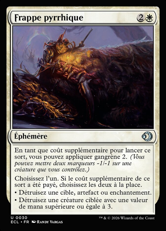 | Rules | As an additional cost to cast this spell, you may blight 2. (You may put two -1/-1 counters on a creature you control.) Choose one. If this spell's additional cost was paid, choose both instead. • Destroy target artifact or enchantment. • Destroy target creature with mana value 3 or greater. |