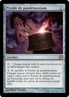 | Rules | : Each player exiles the top card of their library face down. , , Sacrifice Pyxis of Pandemonium: Each player turns face up all cards they own exiled with Pyxis of Pandemonium, then puts all permanent cards among them onto the battlefield. |