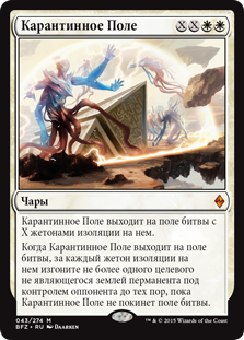 | Rules | Quarantine Field enters the battlefield with X isolation counters on it. When Quarantine Field enters the battlefield, for each isolation counter on it, exile up to one target nonland permanent an opponent controls until Quarantine Field leaves the battlefield. |