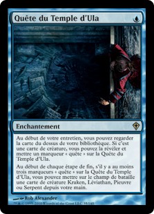 | Rules | At the beginning of your upkeep, you may look at the top card of your library. If it's a creature card, you may reveal it and put a quest counter on Quest for Ula's Temple. At the beginning of each end step, if there are three or more quest counters on Quest for Ula's Temple, you may put a Kraken, Leviathan, Octopus, or Serpent creature card from your hand onto the battlefield. |