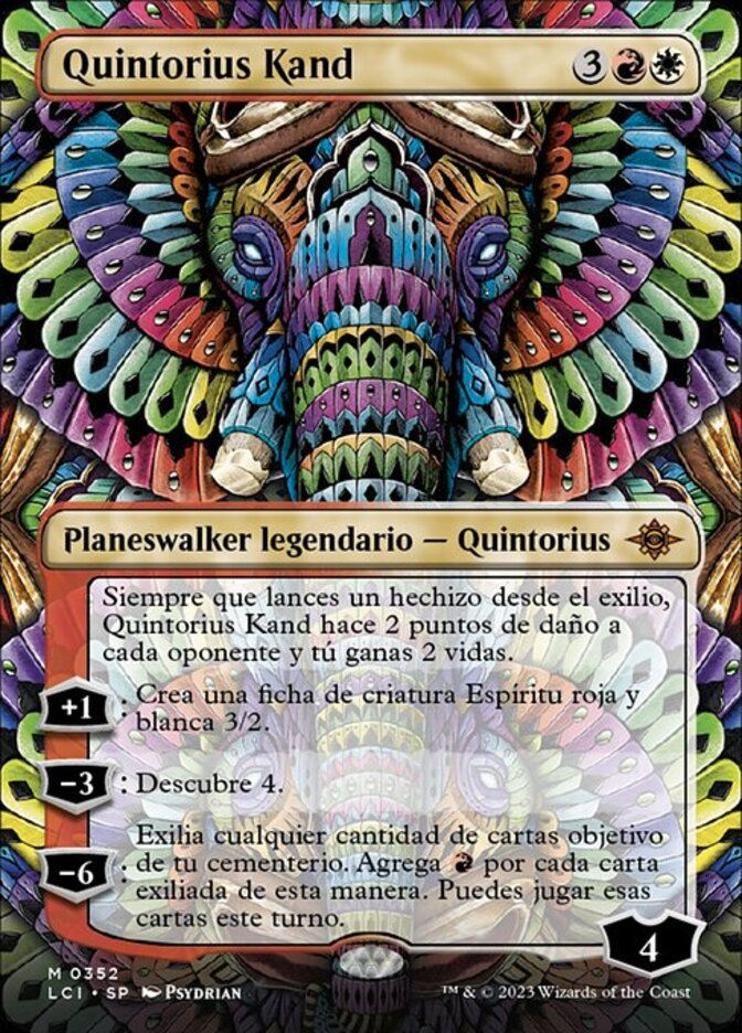 | Rules | Whenever you cast a spell from exile, Quintorius Kand deals 2 damage to each opponent and you gain 2 life. +1: Create a 3/2 red and white Spirit creature token. −3: Discover 4. −6: Exile any number of target cards from your graveyard. Add for each card exiled this way. You may play those cards this turn. |