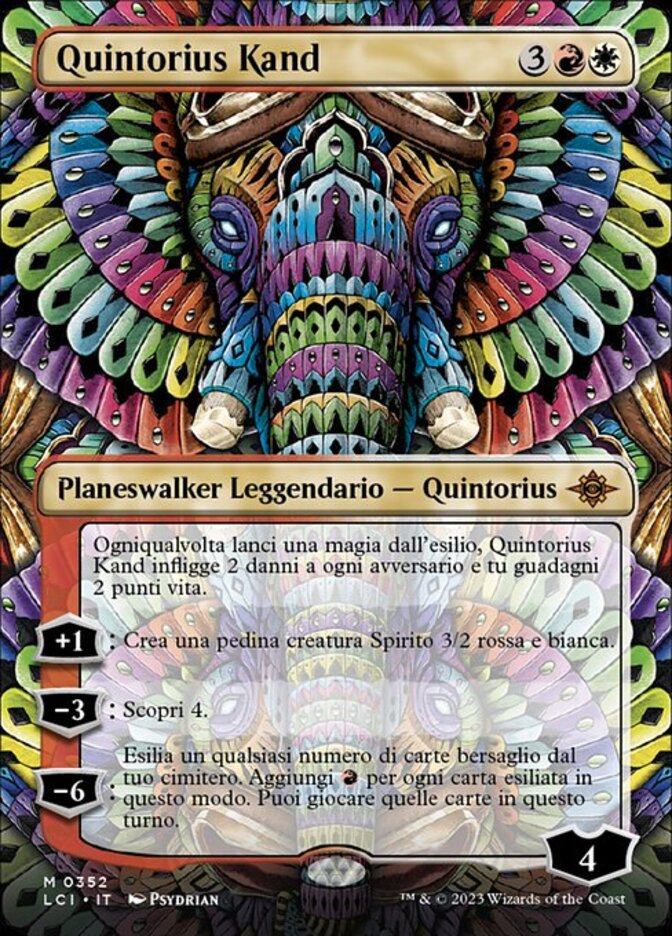 | Rules | Whenever you cast a spell from exile, Quintorius Kand deals 2 damage to each opponent and you gain 2 life. +1: Create a 3/2 red and white Spirit creature token. −3: Discover 4. −6: Exile any number of target cards from your graveyard. Add for each card exiled this way. You may play those cards this turn. |