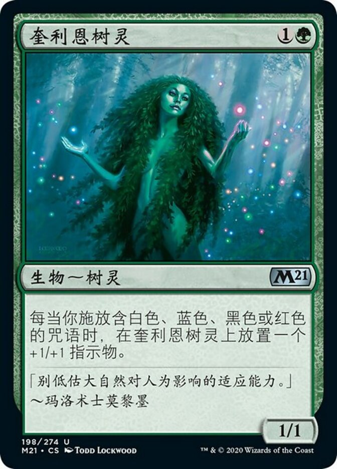 | Rules | Whenever you cast a spell that's white, blue, black, or red, put a +1/+1 counter on Quirion Dryad. |