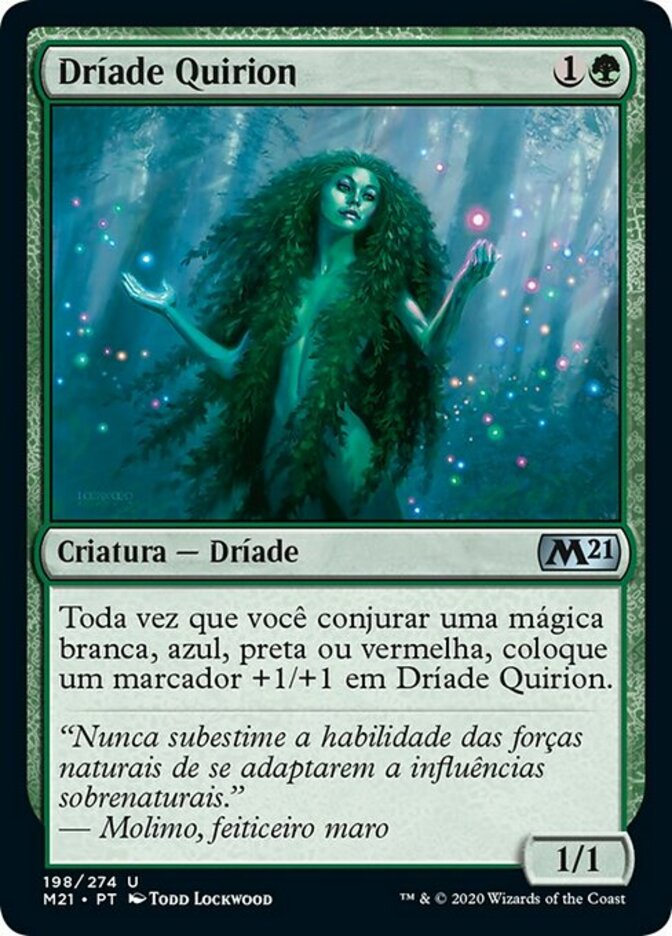 | Rules | Whenever you cast a spell that's white, blue, black, or red, put a +1/+1 counter on Quirion Dryad. |