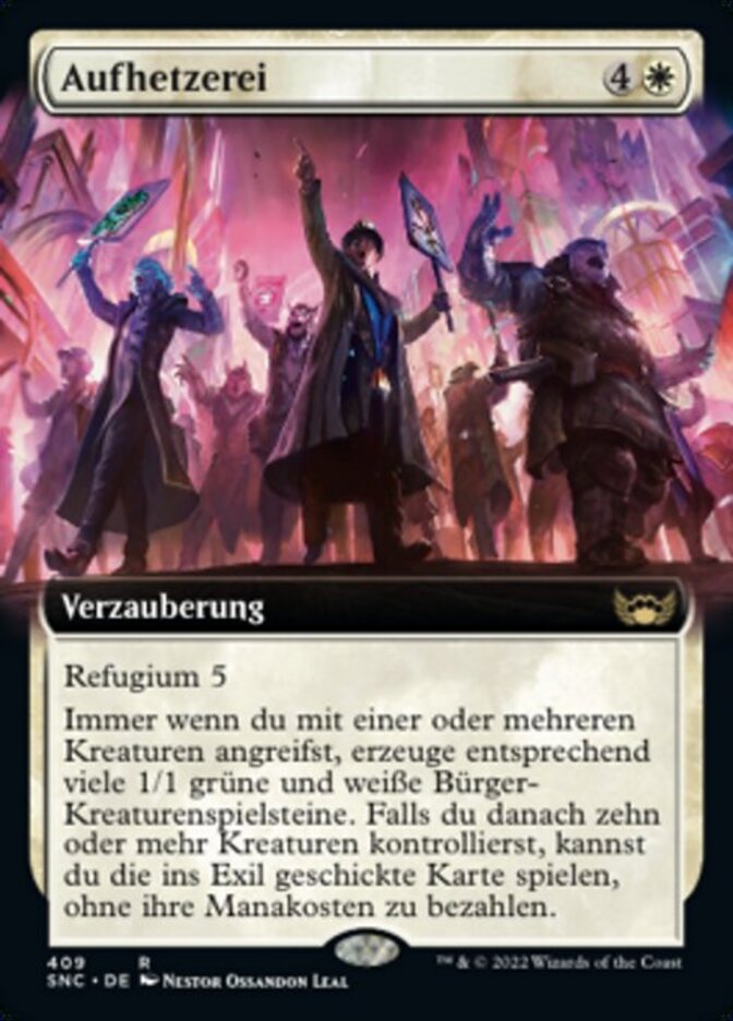 | Rules | Hideaway 5 (When this enchantment enters the battlefield, look at the top five cards of your library, exile one face down, then put the rest on the bottom in a random order.) Whenever you attack with one or more creatures, create that many 1/1 green and white Citizen creature tokens. Then if you control ten or more creatures, you may play the exiled card without paying its mana cost. |