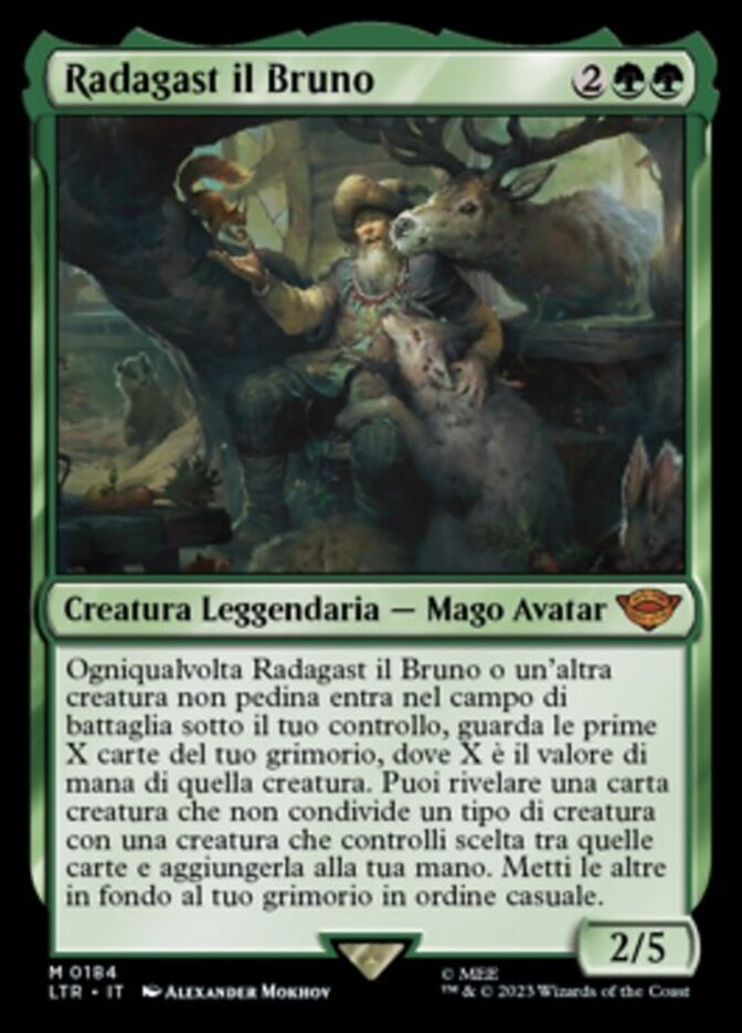 | Rules | Whenever Radagast the Brown or another nontoken creature enters the battlefield under your control, look at the top X cards of your library, where X is that creature's mana value. You may reveal a creature card from among them that doesn't share a creature type with a creature you control and put it into your hand. Put the rest on the bottom of your library in a random order. |