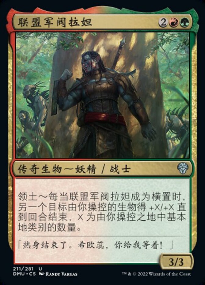 | Rules | Domain — Whenever Radha, Coalition Warlord becomes tapped, another target creature you control gets +X/+X until end of turn, where X is the number of basic land types among lands you control. |