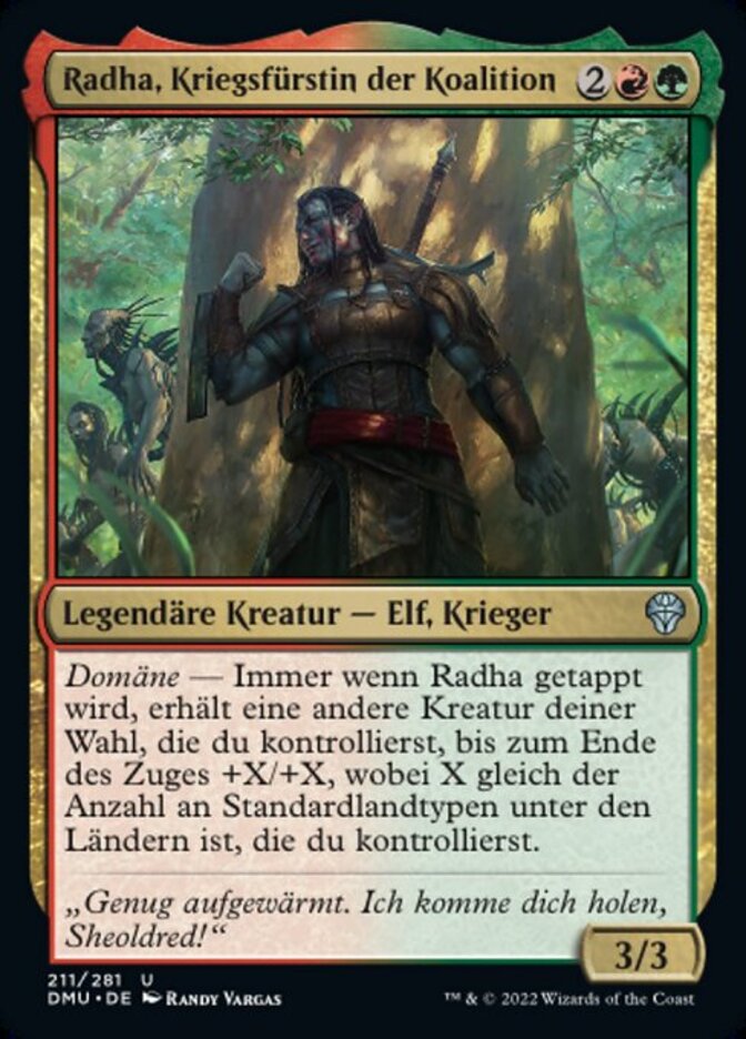 | Rules | Domain — Whenever Radha, Coalition Warlord becomes tapped, another target creature you control gets +X/+X until end of turn, where X is the number of basic land types among lands you control. |