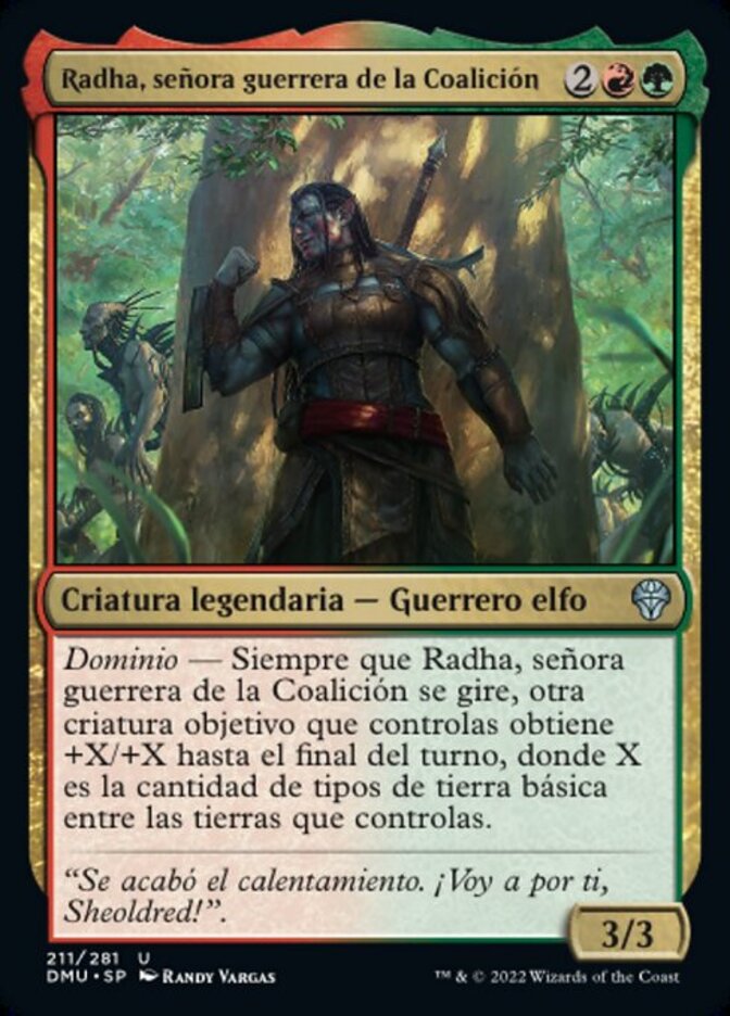 | Rules | Domain — Whenever Radha, Coalition Warlord becomes tapped, another target creature you control gets +X/+X until end of turn, where X is the number of basic land types among lands you control. |