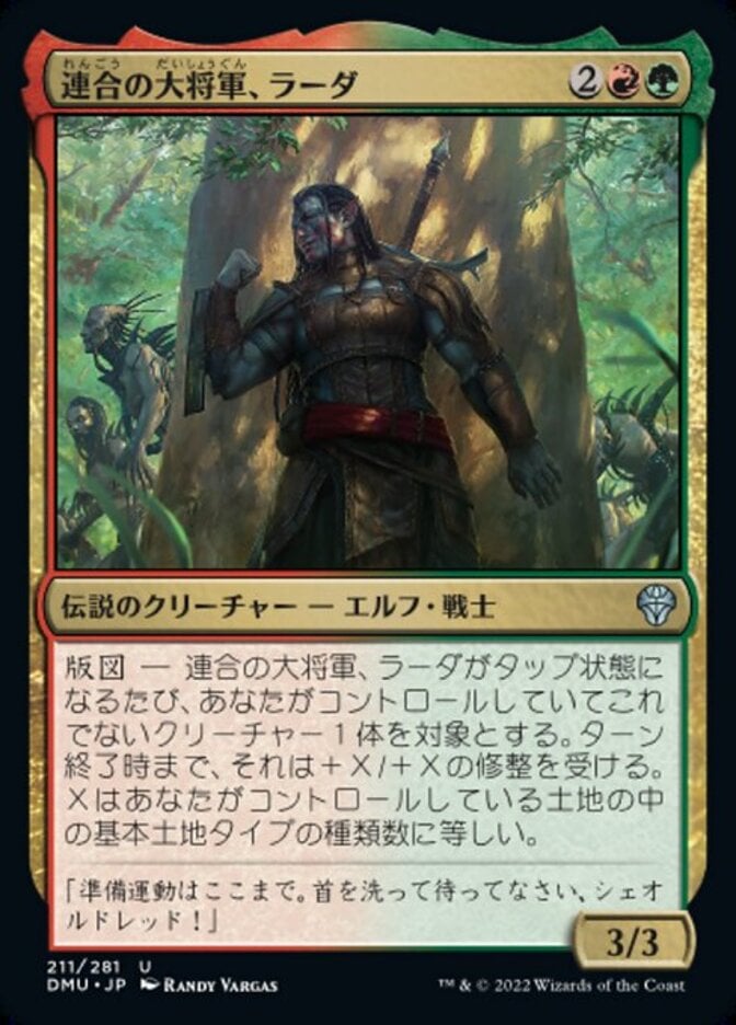 | Rules | Domain — Whenever Radha, Coalition Warlord becomes tapped, another target creature you control gets +X/+X until end of turn, where X is the number of basic land types among lands you control. |