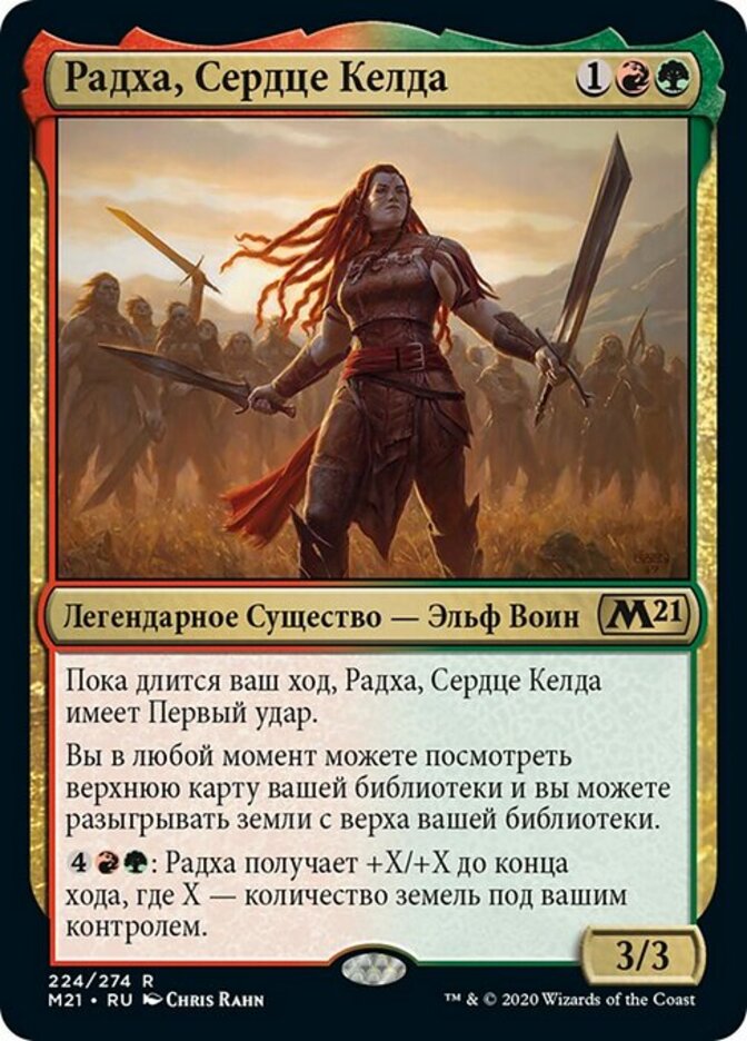 | Rules | As long as it's your turn, Radha, Heart of Keld has first strike. You may look at the top card of your library any time, and you may play lands from the top of your library. : Radha gets +X/+X until end of turn, where X is the number of lands you control. |