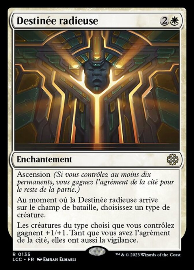 | Rules | Ascend (If you control ten or more permanents, you get the city's blessing for the rest of the game.) As Radiant Destiny enters the battlefield, choose a creature type. Creatures you control of the chosen type get +1/+1. As long as you have the city's blessing, they also have vigilance. |