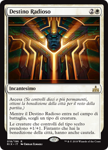 | Rules | Ascend (If you control ten or more permanents, you get the city's blessing for the rest of the game.) As Radiant Destiny enters the battlefield, choose a creature type. Creatures you control of the chosen type get +1/+1. As long as you have the city's blessing, they also have vigilance. |
