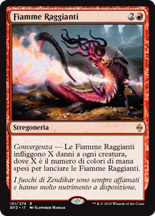 | Rules | Converge — Radiant Flames deals X damage to each creature, where X is the number of colors of mana spent to cast this spell. |