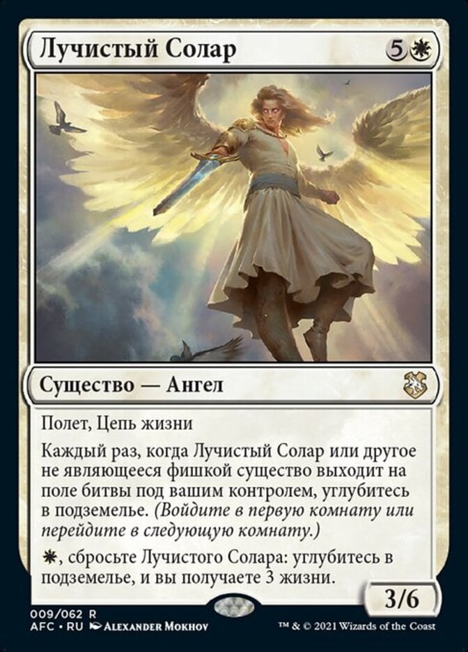 | Rules | Flying, lifelink Whenever Radiant Solar or another nontoken creature enters the battlefield under your control, venture into the dungeon. (Enter the first room or advance to the next room.) , Discard Radiant Solar: Venture into the dungeon and you gain 3 life. |