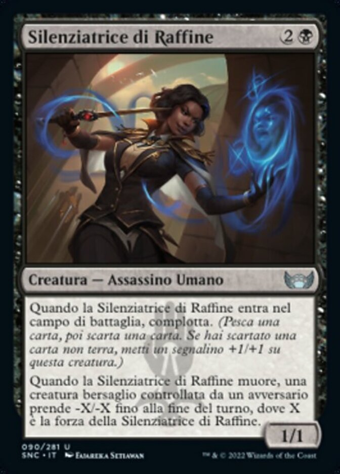 | Rules | When Raffine's Silencer enters the battlefield, it connives. (Draw a card, then discard a card. If you discarded a nonland card, put a +1/+1 counter on this creature.) When Raffine's Silencer dies, target creature an opponent controls gets -X/-X until end of turn, where X is Raffine's Silencer's power. |