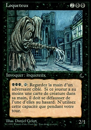 | Rules | , : Target opponent reveals their hand and discards a creature card at random. Activate only during your turn. |