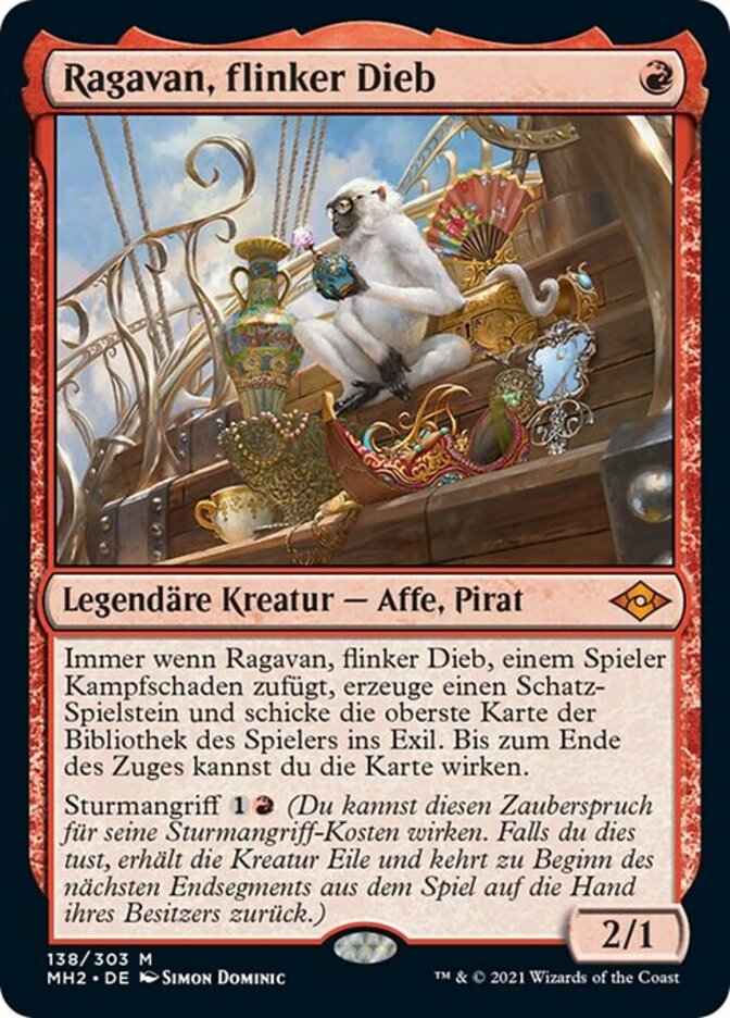 | Rules | Whenever Ragavan, Nimble Pilferer deals combat damage to a player, create a Treasure token and exile the top card of that player's library. Until end of turn, you may cast that card. Dash (You may cast this spell for its dash cost. If you do, it gains haste, and it's returned from the battlefield to its owner's hand at the beginning of the next end step.) |