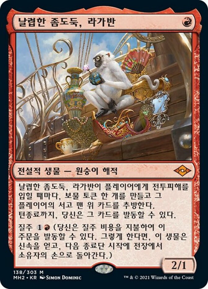 | Rules | Whenever Ragavan, Nimble Pilferer deals combat damage to a player, create a Treasure token and exile the top card of that player's library. Until end of turn, you may cast that card. Dash (You may cast this spell for its dash cost. If you do, it gains haste, and it's returned from the battlefield to its owner's hand at the beginning of the next end step.) |