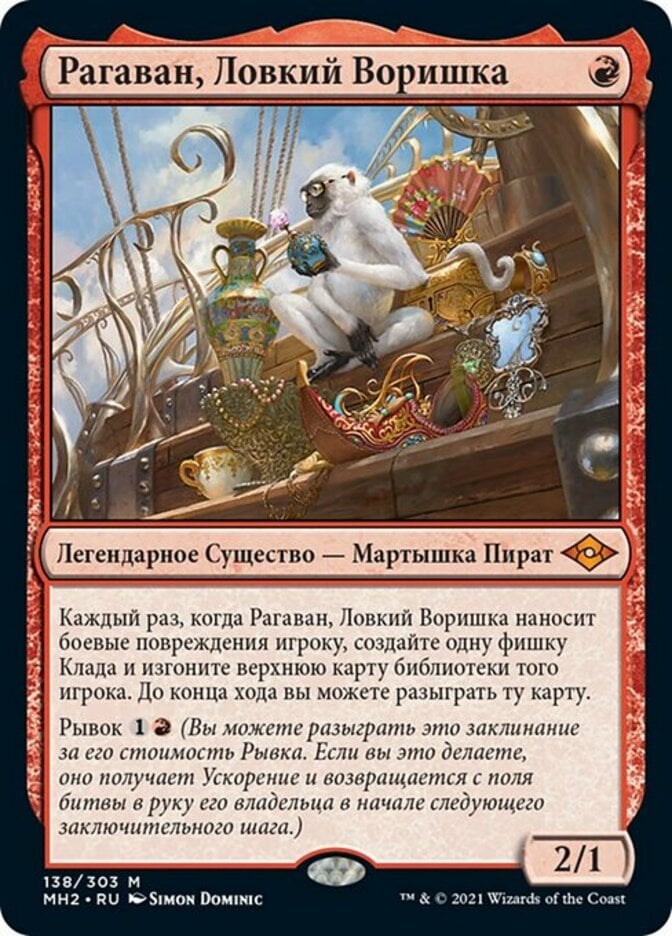 | Rules | Whenever Ragavan, Nimble Pilferer deals combat damage to a player, create a Treasure token and exile the top card of that player's library. Until end of turn, you may cast that card. Dash (You may cast this spell for its dash cost. If you do, it gains haste, and it's returned from the battlefield to its owner's hand at the beginning of the next end step.) |