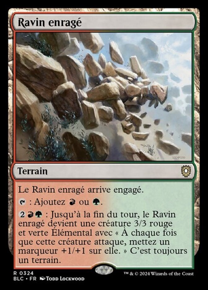 | Rules | Raging Ravine enters the battlefield tapped. : Add or . : Until end of turn, Raging Ravine becomes a 3/3 red and green Elemental creature with "Whenever this creature attacks, put a +1/+1 counter on it." It's still a land. |
