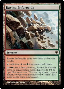 | Rules | Raging Ravine enters the battlefield tapped. : Add or . : Until end of turn, Raging Ravine becomes a 3/3 red and green Elemental creature with "Whenever this creature attacks, put a +1/+1 counter on it." It's still a land. |