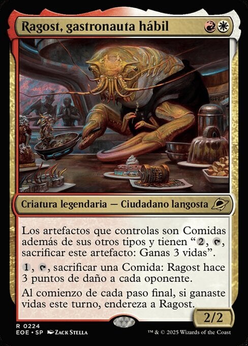 | Rules | Artifacts you control are Foods in addition to their other types and have ", , Sacrifice this artifact: You gain 3 life." , , Sacrifice a Food: Ragost deals 3 damage to each opponent. At the beginning of each end step, if you gained life this turn, untap Ragost. |