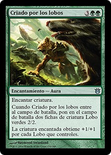| Rules | Enchant creature When Raised by Wolves enters the battlefield, create two 2/2 green Wolf creature tokens. Enchanted creature gets +1/+1 for each Wolf you control. |
