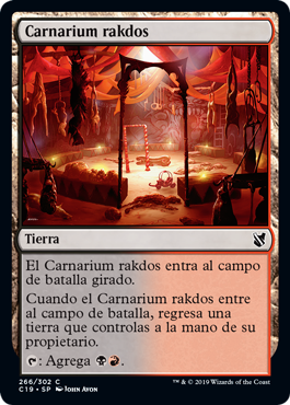 | Rules | Rakdos Carnarium enters the battlefield tapped. When Rakdos Carnarium enters the battlefield, return a land you control to its owner's hand. : Add . |