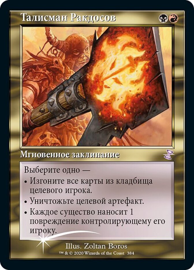 | Rules | Choose one — • Exile target player's graveyard. • Destroy target artifact. • Each creature deals 1 damage to its controller. |