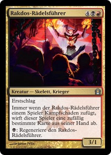 | Rules | First strike Whenever Rakdos Ringleader deals combat damage to a player, that player discards a card at random. : Regenerate Rakdos Ringleader. |