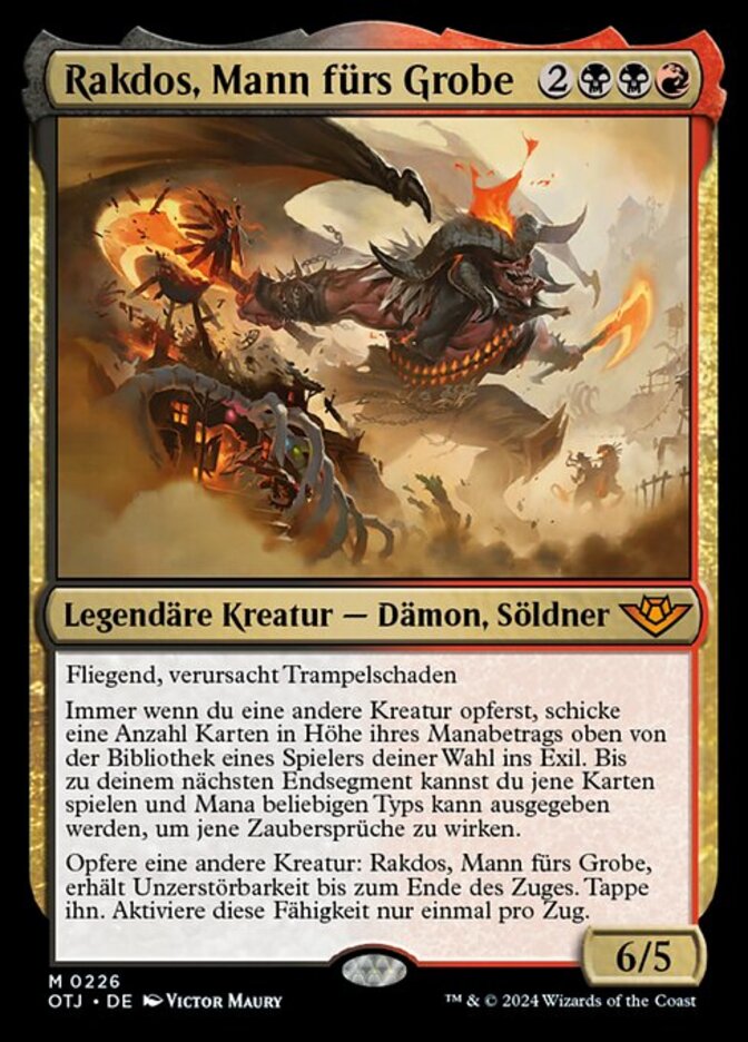 | Rules | Flying, trample Whenever you sacrifice another creature, exile cards equal to its mana value from the top of target player's library. Until your next end step, you may play those cards, and mana of any type can be spent to cast those spells. Sacrifice another creature: Rakdos, the Muscle gains indestructible until end of turn. Tap it. Activate only once each turn. |
