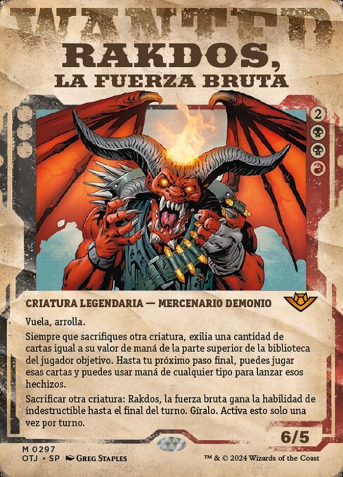 | Rules | Flying, trample Whenever you sacrifice another creature, exile cards equal to its mana value from the top of target player's library. Until your next end step, you may play those cards, and mana of any type can be spent to cast those spells. Sacrifice another creature: Rakdos, the Muscle gains indestructible until end of turn. Tap it. Activate only once each turn. |