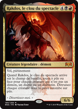 | Rules | Flying, trample When Rakdos, the Showstopper enters the battlefield, flip a coin for each creature that isn't a Demon, Devil, or Imp. Destroy each creature whose coin comes up tails. |