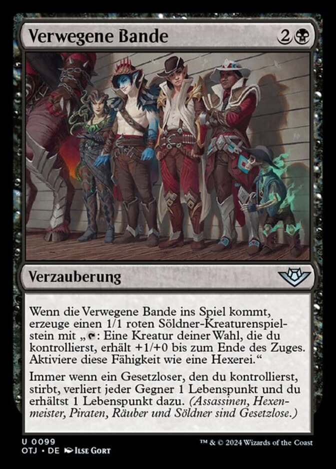 | Rules | When Rakish Crew enters the battlefield, create a 1/1 red Mercenary creature token with ": Target creature you control gets +1/+0 until end of turn. Activate only as a sorcery." Whenever an outlaw you control dies, each opponent loses 1 life and you gain 1 life. (Assassins, Mercenaries, Pirates, Rogues, and Warlocks are outlaws.) |